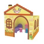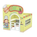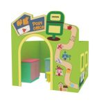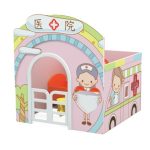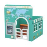 This charming miniature bank building, designed with a cheerful facade, features a welcoming arched entrance secured by a little white picket fence door. The side walls boast windows adorned with classic striped awnings, adding to its friendly and inviting appearance. The centerpiece of this set is the fully interactive ATM machine, complete with a dedicated slot for the included wooden “Bank Card.” Children can enjoy the satisfying tactile experience of inserting and retrieving their card, mimicking real-world transactions. The ATM panel clearly displays recognizable icons and bilingual labels such as “ATM,” “Union Pay,” and “银联” (Yínlián), fostering early language exposure and global awareness.