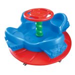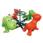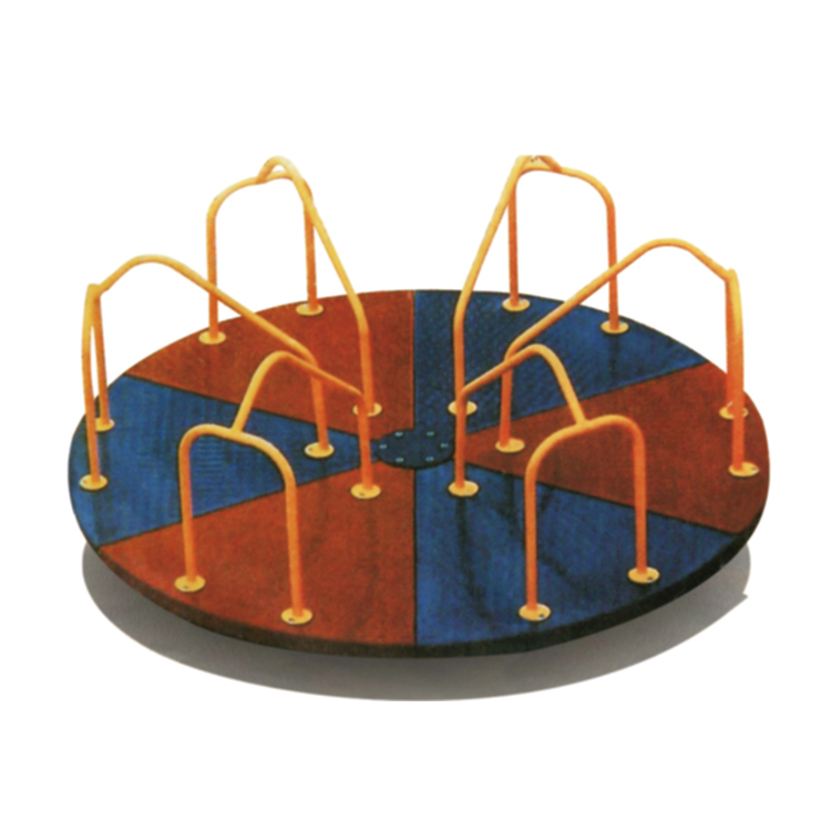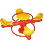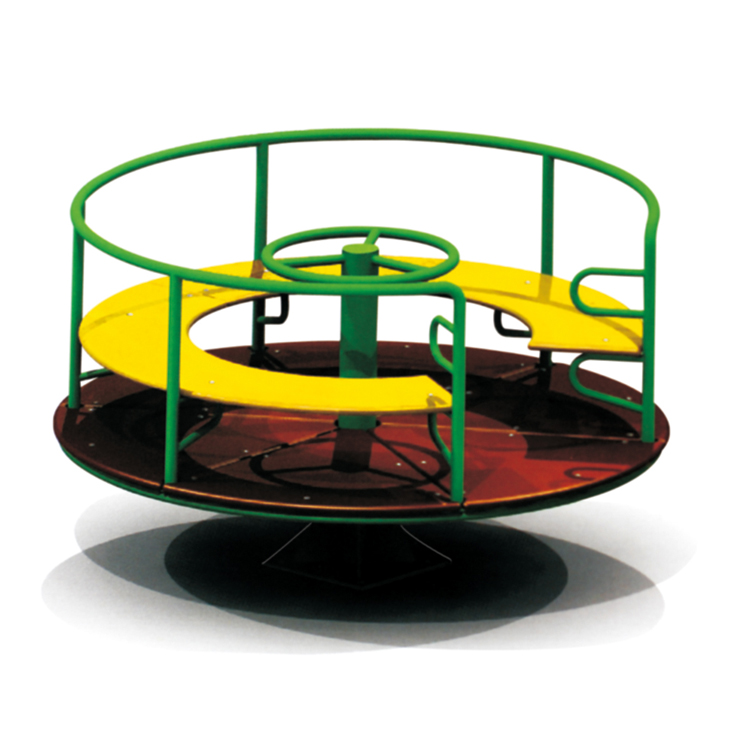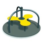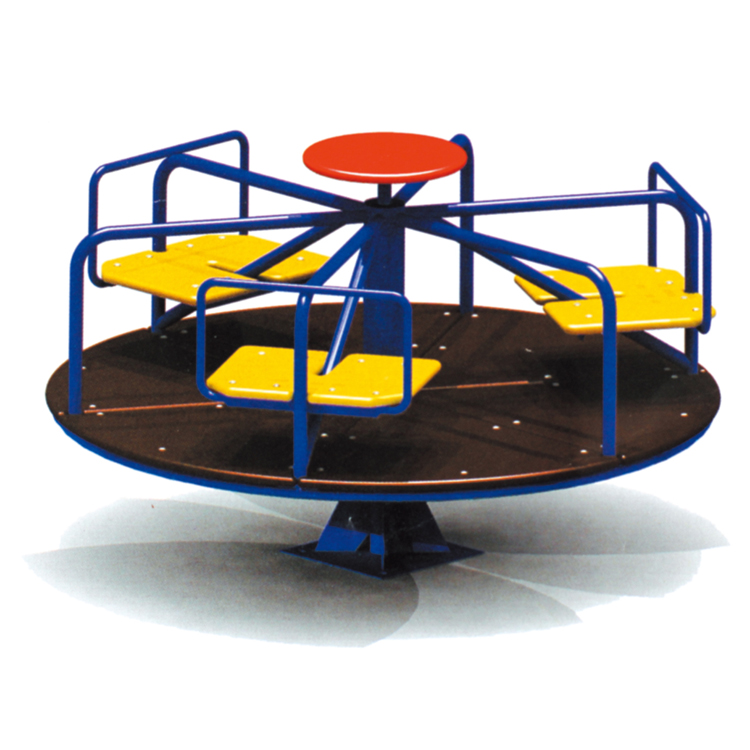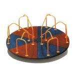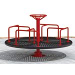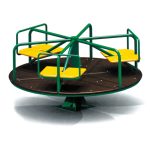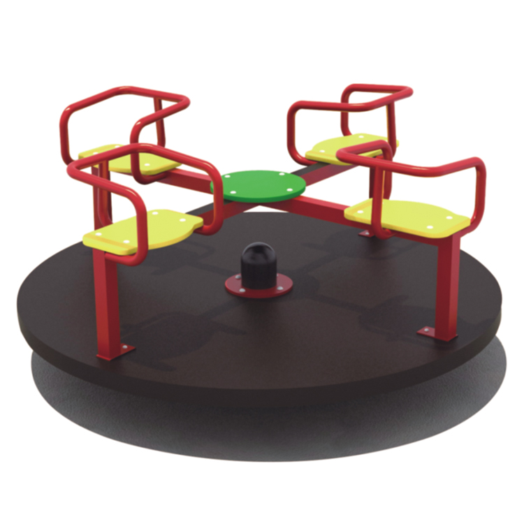 This classic 4-seat roundabout carousel is a timeless addition to any play space. It features a durable dark brown rotating platform with a subtle textured finish, ensuring stability and smooth motion. Four bright yellow seat pads with red powder-coated steel frames and grab bars are evenly spaced, providing secure and colorful seating. The vibrant green central turntable acts as the rotation point, connected to a robust black center post. Designed for interactive group play, it encourages social engagement and cooperative fun as children spin together. Built with weather-resistant plastics and coated metals, this carousel is low-maintenance and ideal for outdoor installation in public parks, schoolyards, residential communities, and commercial playgrounds.