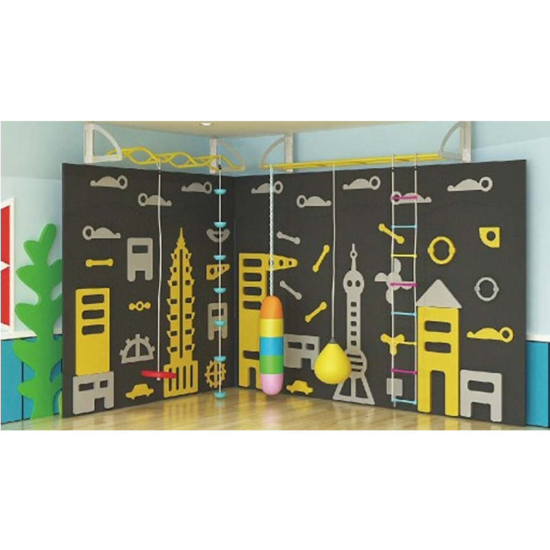 Built for durability and safety, this set is constructed from high-quality, child-safe materials. The climbing panel features a sturdy black base with securely mounted, non-toxic PVC holds that provide excellent grip. Key components like the red horizontal bar and the yellow overhead bar are rated for active use, while the design seamlessly integrates with standard safety mats (pictured) to ensure a soft landing, giving parents and supervisors complete peace of mind.