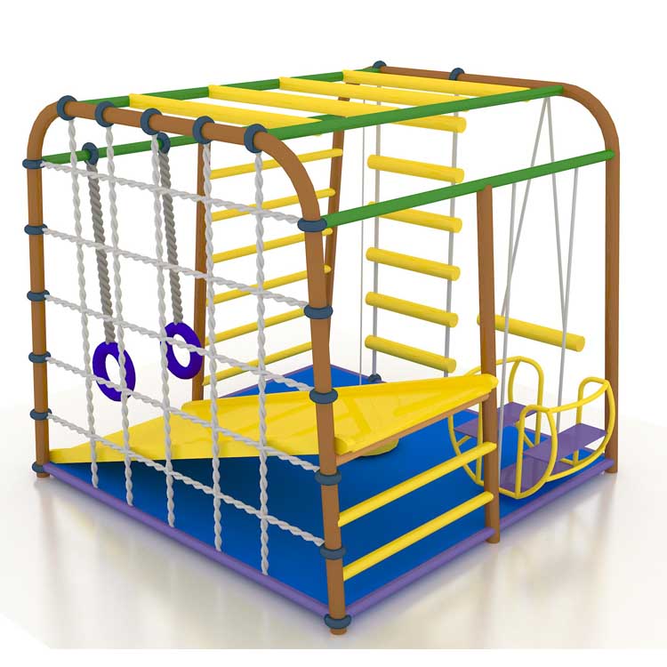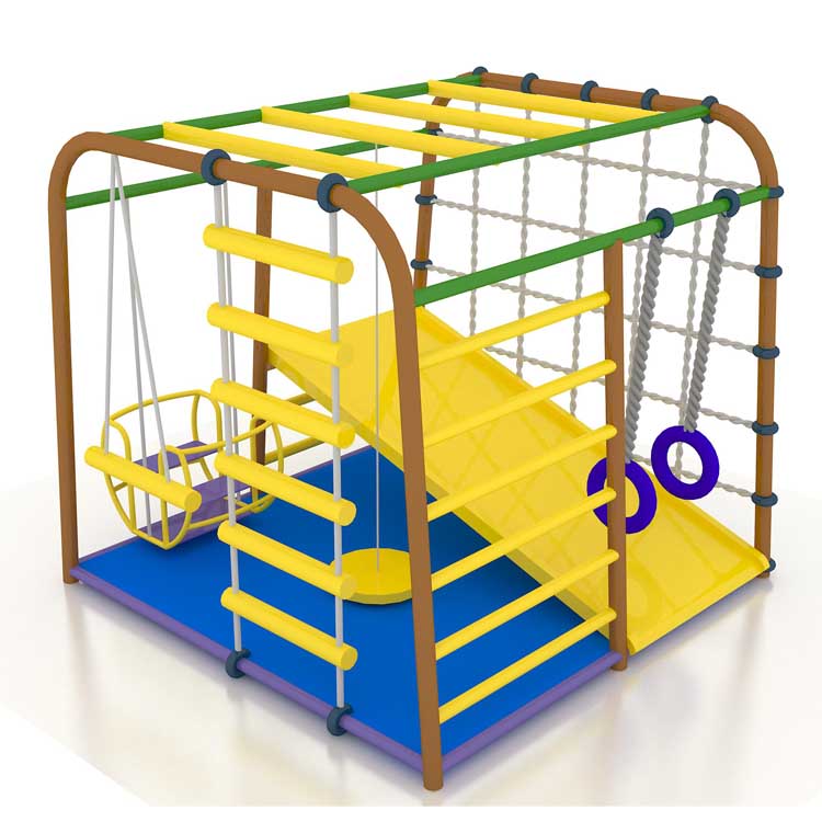 This vibrant multifunctional indoor play cube integrates multiple activities into a compact, safe design. Its sturdy red and yellow metal frame forms a colorful cubic structure, ideal for limited spaces. The set includes a green slide, a yellow rope ladder, a swing with a cute blue whale seat, a climbing net, and two purple climbing rings—all designed to develop motor skills, balance, and coordination. The soft blue and yellow interlocking floor mats provide a safe landing surface. Perfect for children aged 3-8, this durable, non-toxic play cube is an excellent choice for home playrooms, kindergartens, daycare centers, and indoor commercial play areas, offering endless active fun regardless of weather.