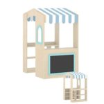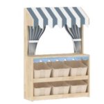 Built from smooth, light-toned wood with a warm, natural finish, the stall is both sturdy and safe for little hands. Its most distinctive feature is the charming blue-and-white striped fabric canopy, edged with playful wavy cuts. This adorable awning not only provides shade for the “shopkeeper” but instantly defines the playful setting. The canopy is complemented by matching striped curtains on both sides, which can be neatly tied back with the included white ribbons, allowing for open interaction or a bit of theatrical flair. A thoughtful touch of blue wavy trim adorns the front counter, adding to the set’s cohesive and delightful aesthetic.