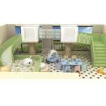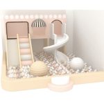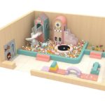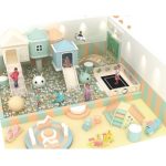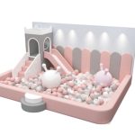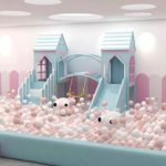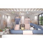 This LUXE HOME playground creates an enchanting, unified world for play. The soft lavender flooring with white dots sets a whimsical base, beautifully complemented by a charming pink playhouse, a vibrant ball pit, and a coordinating slide. Additional zones for building blocks and soft shapes, all tied together with playful fencing, offer a visually stimulating and organized environment that encourages endless exploration.